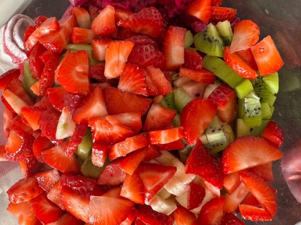 Gemeinsam schnippeln wir daraus einen kunterbunt, fröhlichen Obstsalat für den Nachtisch!