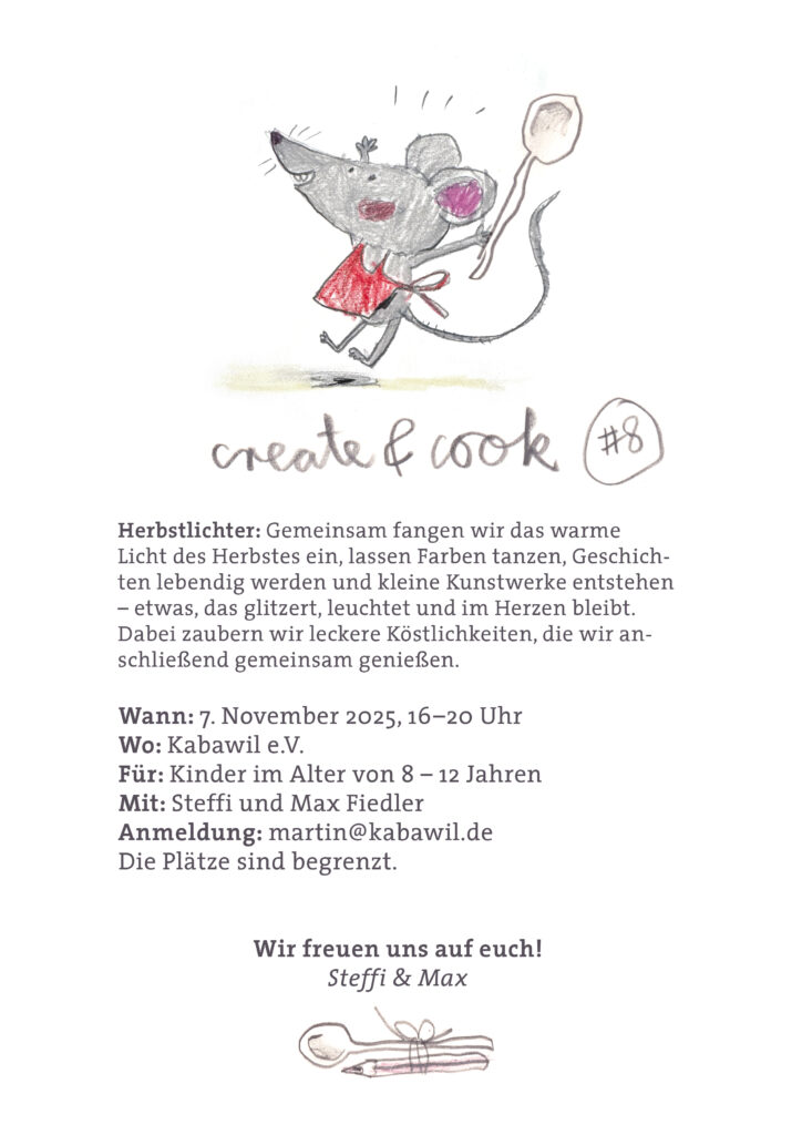 Wir laden euch ein, an einem herbstlich-bunten Cook & Create Tisch voller Düfte, Farben und magischer Momente zu werkeln. Gemeinsam backen, gestalten, zeichnen, basteln und genießen wir – von Mäusebroten, Crumble und Vanilleeis bis zu kleinen, geheimnisvollen Herbstmäusen aus Nüssen und Stoffresten. Und für eure eigenen Ideen stellen wir gemeinsam für jeden ein selbstgemachtes Heftchen her, in dem ihr Skizzen, Gedanken und Rezepte festhalten könnt.
