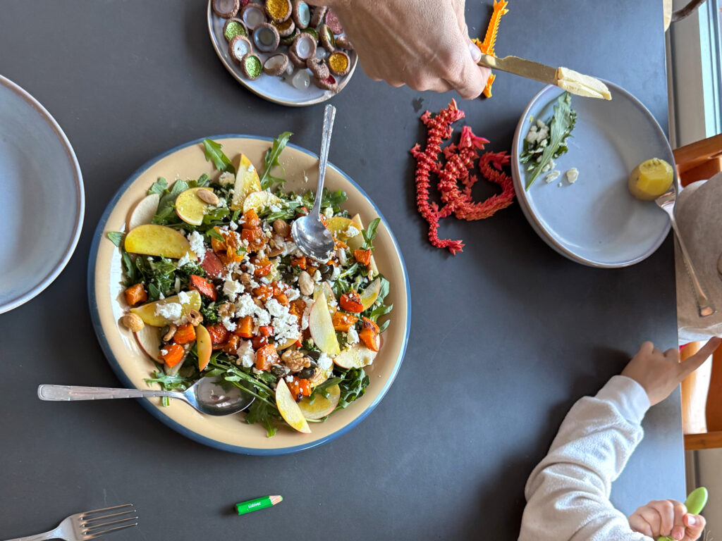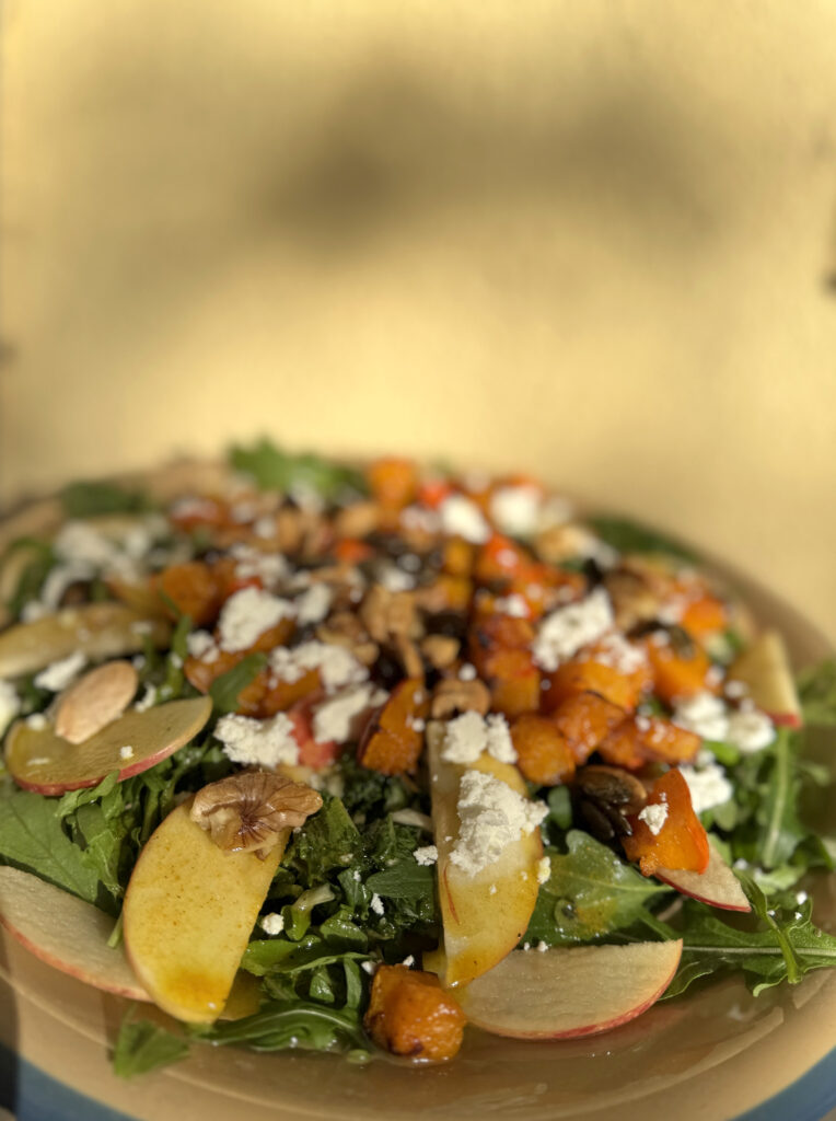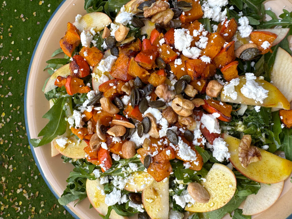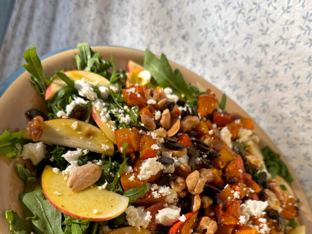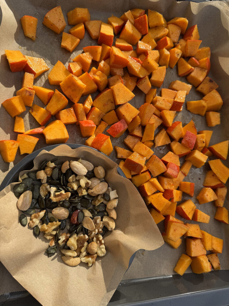 Kürbis und Crunch drüber, optional Feta oder Avocado.