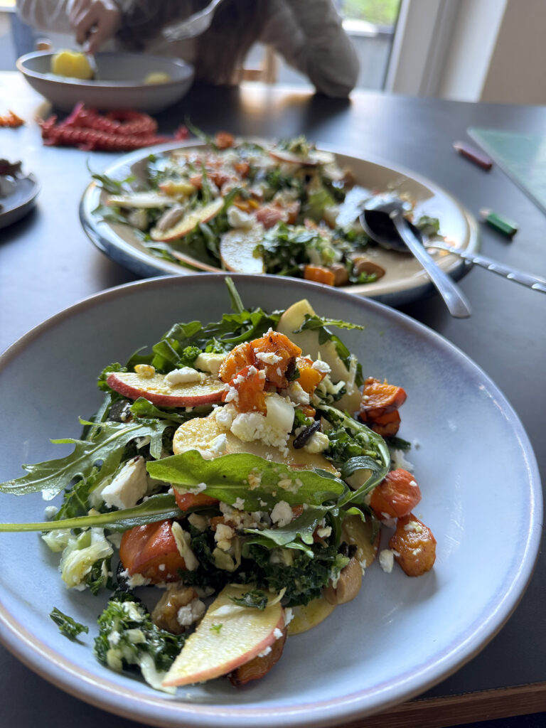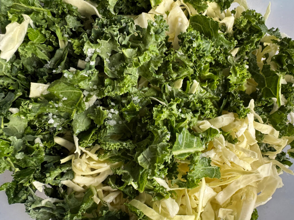 Die Basis aus Spitzkohl und Grünkohl wird kurz massiert – nur ein paar sanfte Bewegungen mit Salz und Zitronensaft – und schon öffnet sich der Kohl, wird weich, süßlich, bekömmlich und richtig juicy. Apfelsticks und frische Kräuter setzen frische Akzente, Rucola bringt, wenn man mag, eine leichte Pfeffernote.