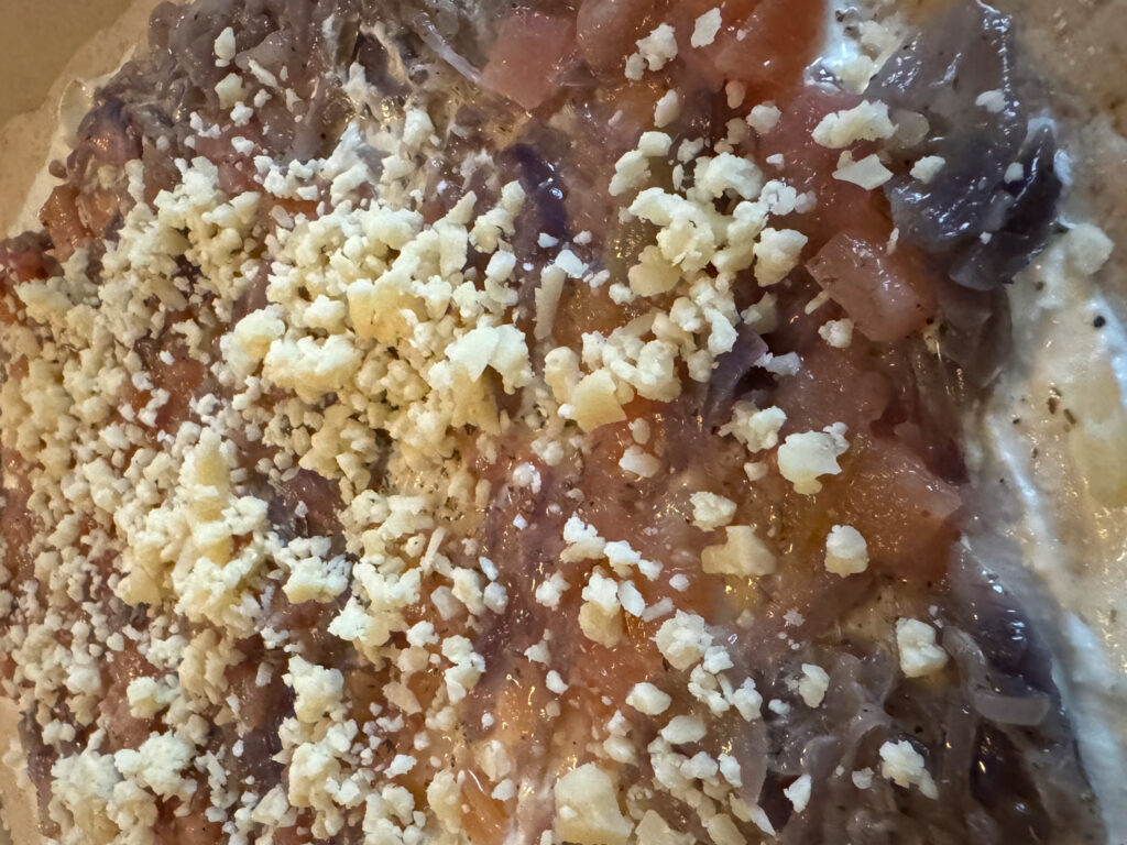 Für die Füllung: 3–4 große Zwiebeln | 2 EL Butter oder Olivenöl | 1 TL Zucker | 1 TL frischer oder getrockneter Thymian | 200 g Frischkäse | 2,3,4 El Milch | 100–150 g würziger Käse (ich hatte Gruyère und Comte) | Salz & Pfeffer | wer mag kann Apfelchutney auch direkt mit hineinfallen, dazu einfach ein paar Kleckse auf die Zwiebeln verteilen.
