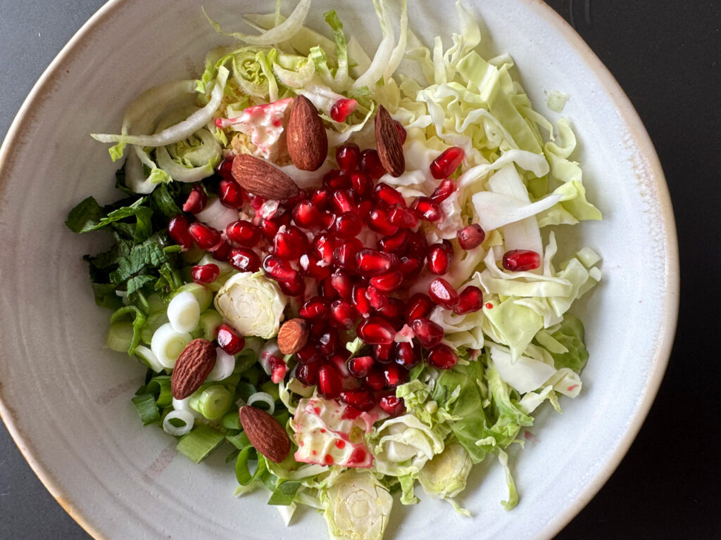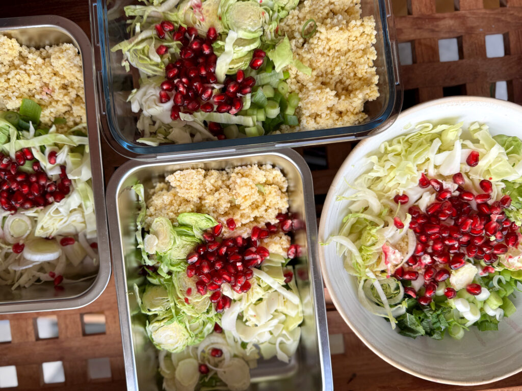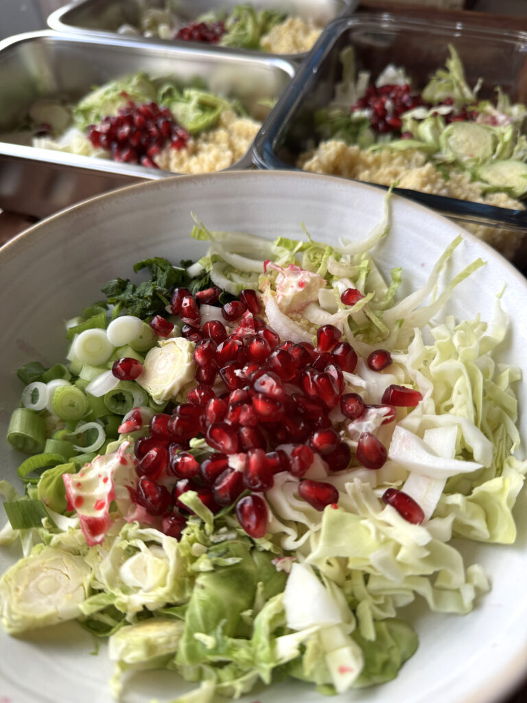 Er liefert langanhaltende Energie durch komplexe Kohlenhydrate, ist glutenfrei und gut verträglich. Die Kombination aus Kohlsorten, Granatapfel und Kräutern bringt viele Vitamine, Mineralstoffe und Antioxidantien, während Chicorée wertvolle Bitterstoffe für Verdauung und Leber liefert. Nüsse sorgen für gesunde Fette und Crunch, das Dressing für Frische und Balance.