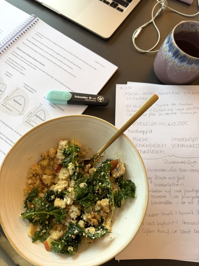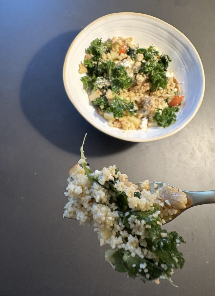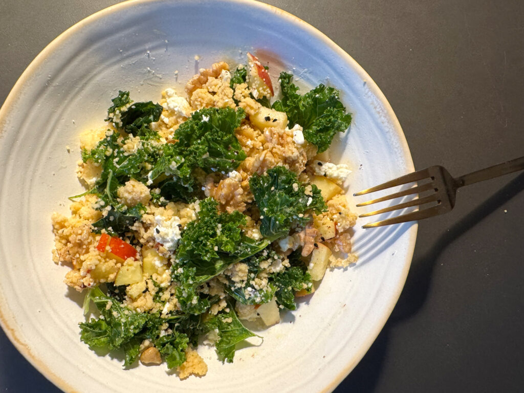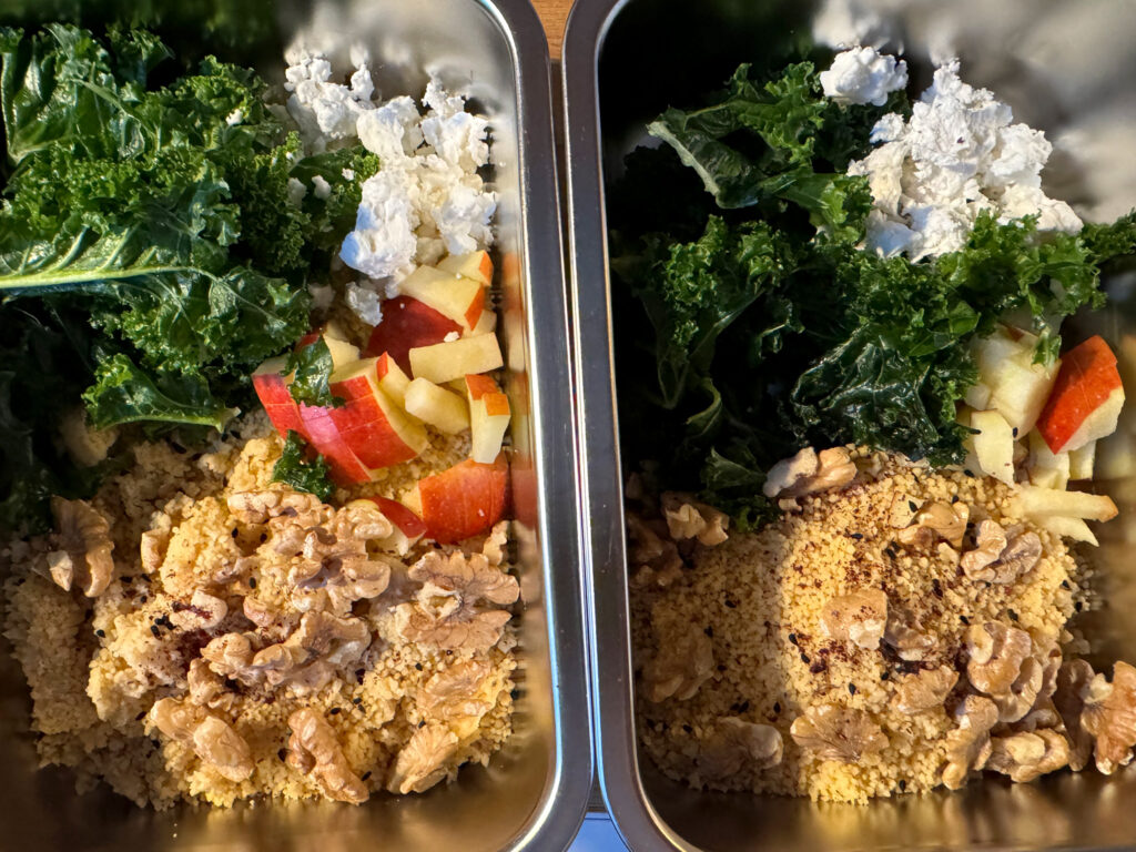 Für 2–3 Portione:n 200 g Kichererbsen-Couscous | 1 kleine Handvoll Grünkohl | 1 säuerlicher Apfel (z. B. Boskoop oder Elstar) | 80–100 g Feta | 1 Handvoll Walnüsse
