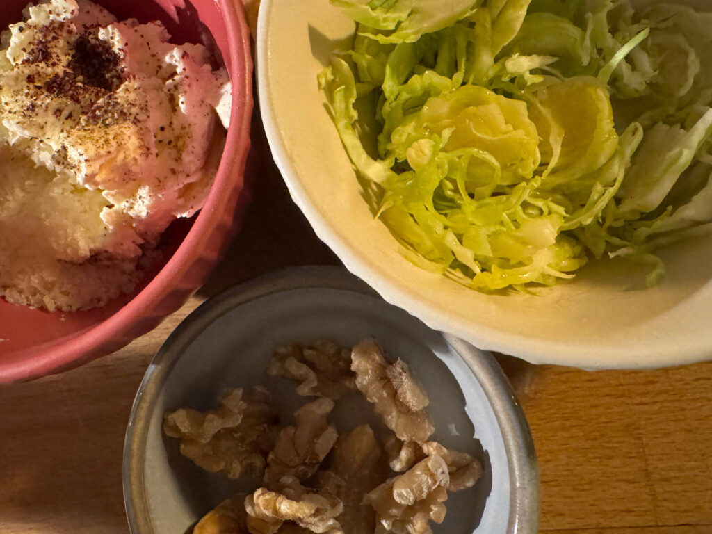 Zutaten (für 1 großes Sandwich): 2 Scheiben Sauerteigbrot (oder guter Toast) | 5–6 Rosenkohlröschen | 1 TL Olivenöl | Salz | 1 TL Zitronensaft | etwas Zitronenabrieb | 2 EL Frischkäse oder Ricotta | Zitronenabrieb | schwarzer Pfeffer | optional: ½ TL Honig | Außerdem: 1 TL milder Senf (Dijon oder körnig) ca. 40 g Bergkäse / Gruyère, grob gerieben | optional: 1 EL gehackte Haselnüsse oder Walnüsse | Butter oder Olivenöl fürs Brot