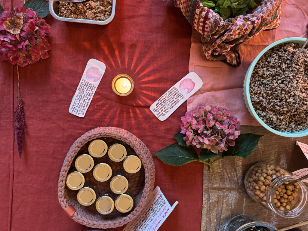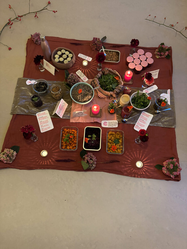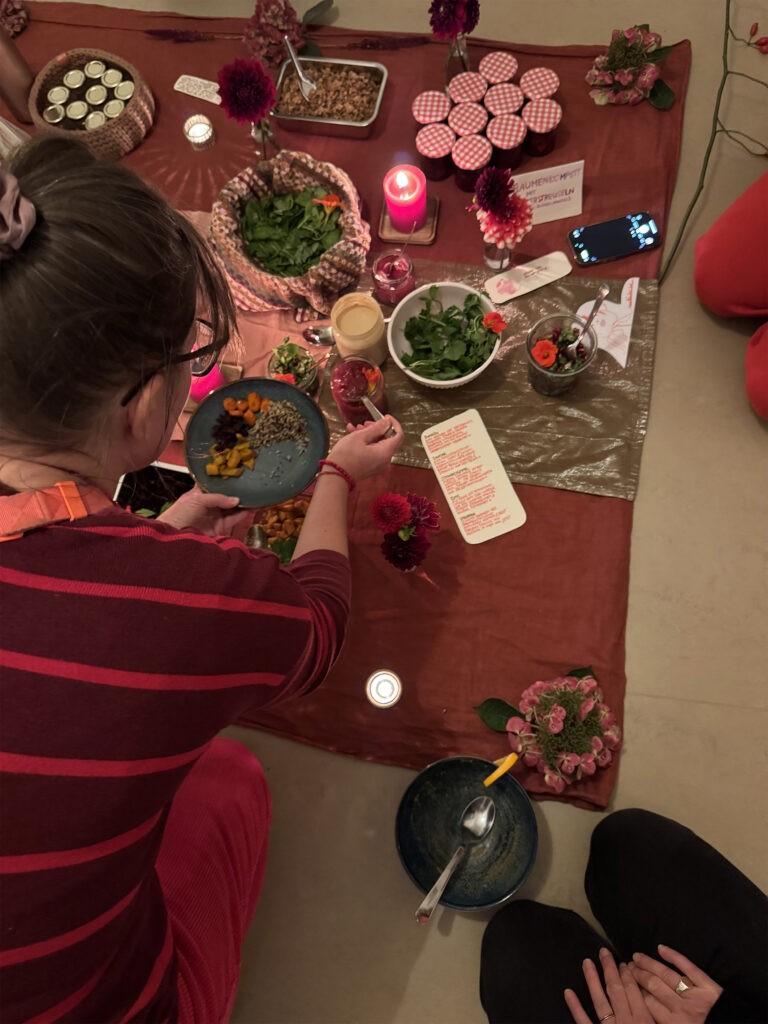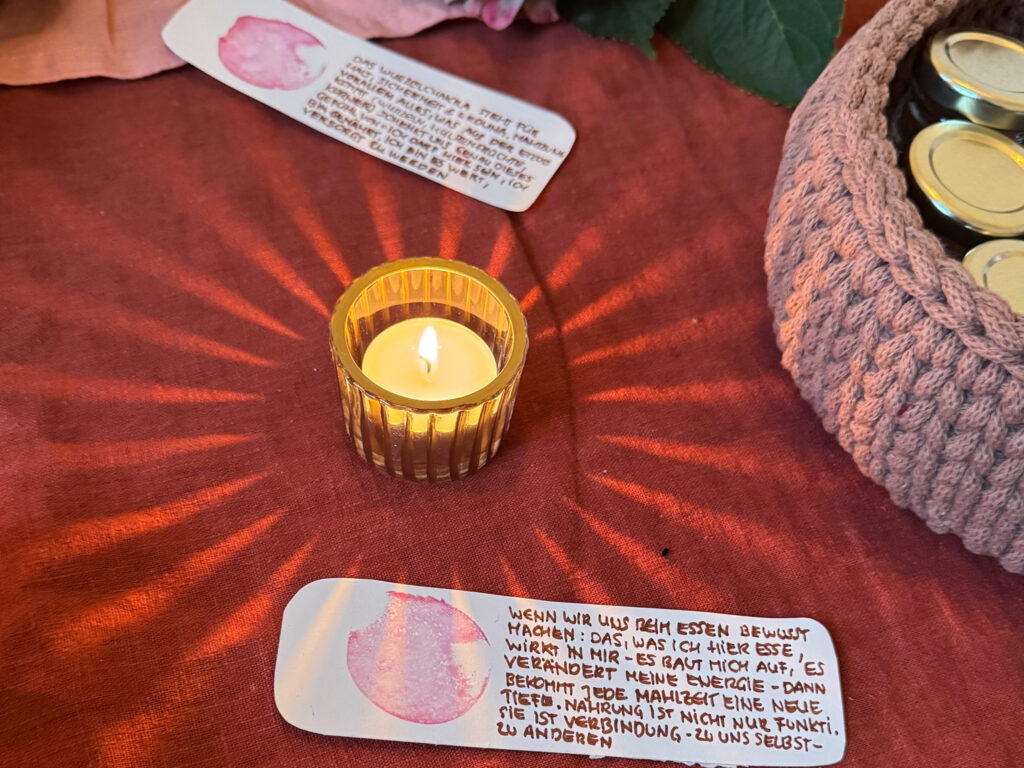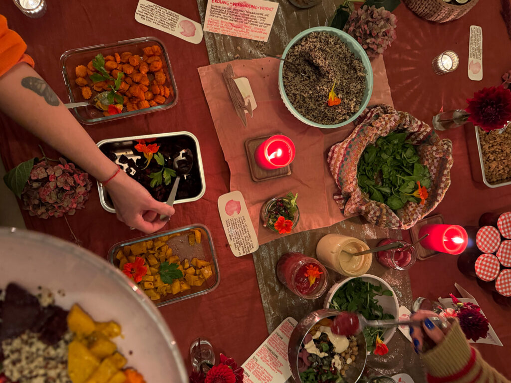 Rote Wurzeln, warmes Brot, süße Datteln. Jeder Bissen ein Anker, jede Gewürznote ein Flüstern: Du bist geerdet. Du bist gehalten. Du bist es wert. Knusprige Nüsse, fermentiertes Gemüse, ein Hauch Minze – Erde, Wärme, Lebenskraft auf dem Teller. Ein Moment, nur für dich, um anzukommen, zu spüren, zu genießen. Schlicht, nährend, achtsam – ein kleines Ritual für Körper, Herz und Seele.