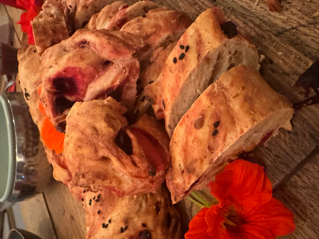 Frisches Rote-Bete-Walnuss-Brot mit Olivenöl und Zaatar – erdend und mineralstoffreich, stärkt Blut und Kreislauf. (Bodenhaftung)