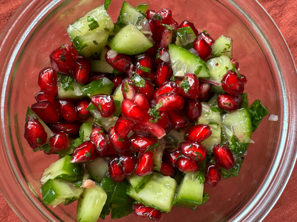 Gurken-Granatapfel-Salsa (Rezeptvorschlag): 3 Minigurken, gewürfelt | 1 Granatapfel (Kerne, ca. 150 g) | 1 kleine rote Zwiebel, feinst gewürfelt | 1 kleine Handvoll Minze & 1 kleine handvoll Petersilie, fein gehackt | 3 EL Olivenöl | Saft von 1 Zitrone | Salz, Pfeffer