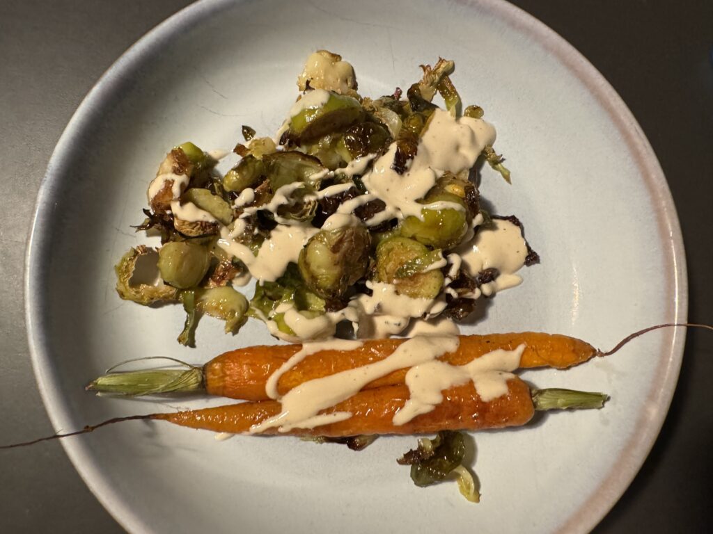 500 g Rosenkohl | 2,3,4, Bundmöhren | olivenöl, salz, pfeffer | 3 el tahin | 3 el zitronensaft | 3-5 El wasser | salz, pfeffer