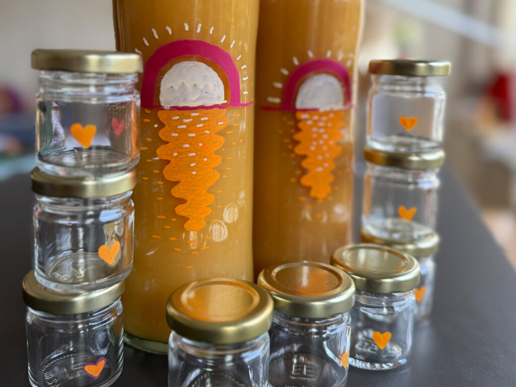 Kurkuma, Limettensaft, Honig/Ahornsirup, Ingwer und Salz hinzufügen. Abschmecken, nach belieben etwas Chilli, etwas schwarzen Pfeffer dazu …