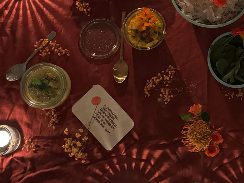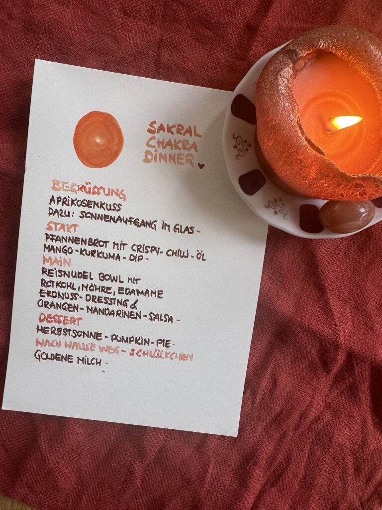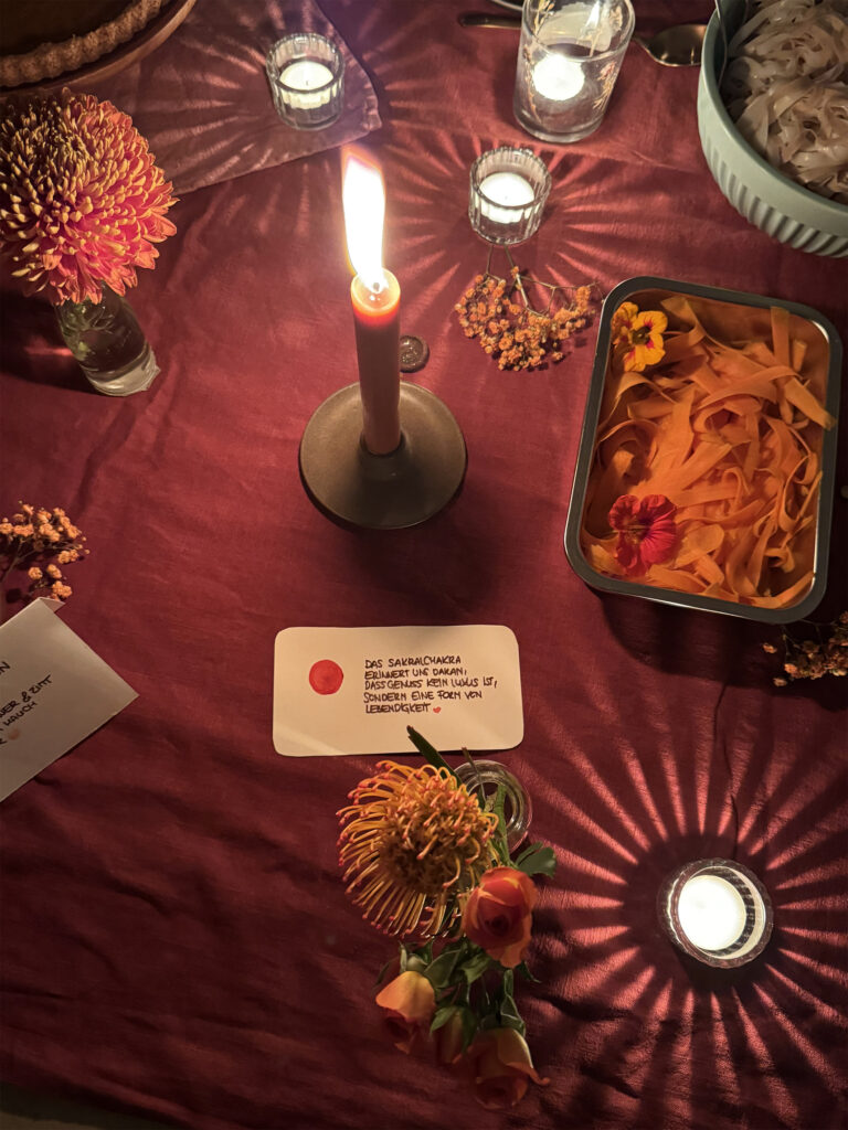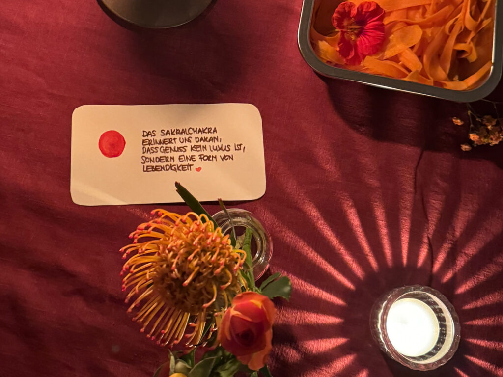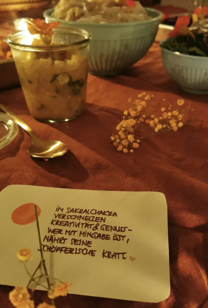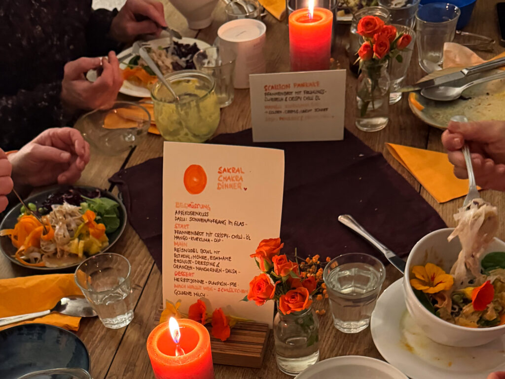 Am vergangenen Mittwoche durfte ich zum Abschluss unserer 40 Tage Sakral-Chakra-Challenge erneut ein Dinner im Naad Room ausrichten. Speziell auf das Sakralchakra abgestimmt (vertiefenderes hier») habe ich ein Menü zusammengestellt, dass das Sakral-Chakra optimal nährt, in den Fluss bringt, stärkt und alles was dazugehört herauskitzelt. Eingebettet im Schein der Kerzen, wundervollen Gesrächen und der Magie des gemeinsamen Chantens. Danke Naad-Room für euer Vertrauen & die wunderbare Kooperation. Wie Sandra es so schön gesagt hat: It´s a Match! Danke an Alle, die dabei waren, teilweise weite Wege auf sich genommen, Kunst und Blumen mitgebracht und diesen Abend so wunderbar gemacht haben. Feuer Pferd, wir kommen!