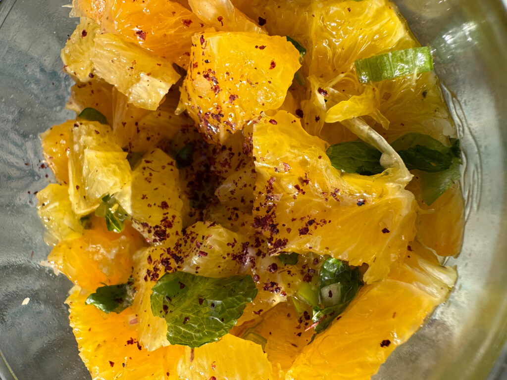 Zutaten: 3 Orangen | 3 Mandarinen | 1 kleine rote Chili (optional, entkernt) | 1/2 oder 1 kleine rote Zwiebel oder Schalotte | 1 Frühlingsziwbel, in feine Ringe | 1 EL Ahornsirup | 1 EL Limettensaft (frisch) | 1–2 EL Olivenöl. Salz & Pfeffer nach Geschmack. Frischer Koriander und/oder Minze zum Garnieren und auch noch etwas feingehackt zum untermischen, nach belieben.