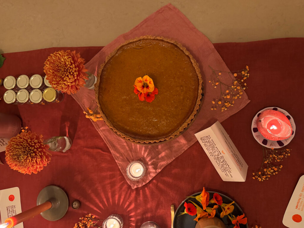 Füllung: 500 g Kürbispüree (Hokkaido in Stück, auf Backblech, etwa 25-30 Minuten bei 200° rösten, kurz etwas abkühlen lassen, dann fein pürieren) | 150 g brauner Zucker | 1 TL Zimt | 1/2 TL Ingwer | 1/4 TL Muskat | 1 Prise Nelke (optional) | 1/2 TL Salz | 230 ml Sahne/Milch gesamt (200 Sahne + 30 ml Pflanzenmilch Hafer-Soja)) | 1 TL Vanilleextrakt | 2,5–3 EL Stärke (oder 3,5–4 EL Maisstärke) | 1 grosszügiger EL Mandelmus | Optional: 1 EL Ahornsirup