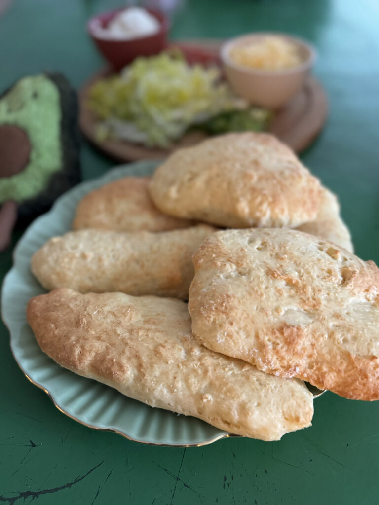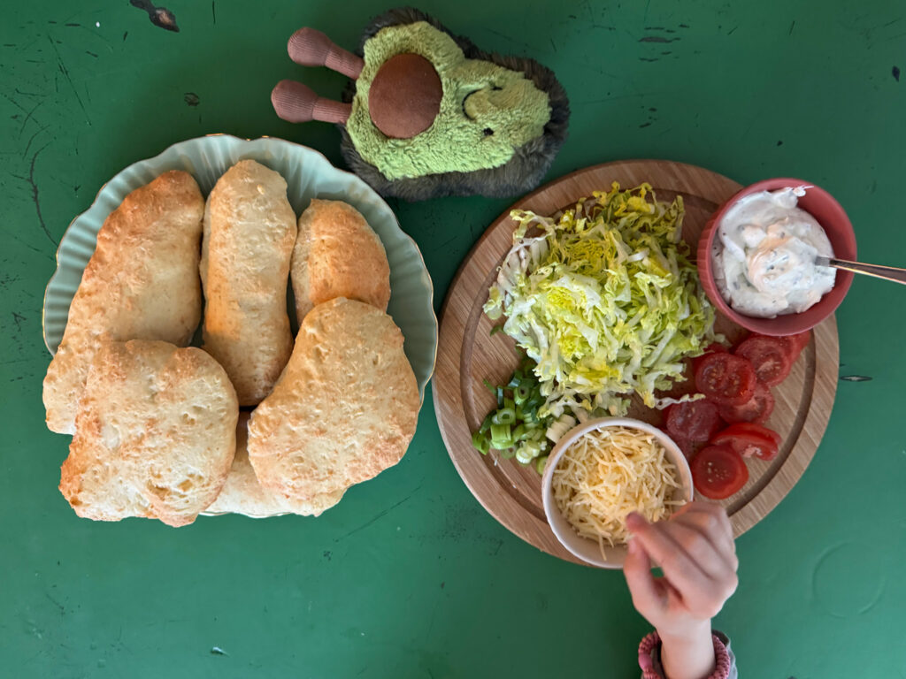 Alles für den Teig vermischen, kneten und durch 4 oder 6 Teilen. Die Teile zu Fladen formen und auf ein mit Backpapier belegtes Blech legen. Die Fladen für 12-15 Minuten bei 180° im Backofen backen. Wir haben sie mit Kräuterquark, Tomaten, Salt und Reibekäse getippt. Top! Schell, Einfach und Lecker!