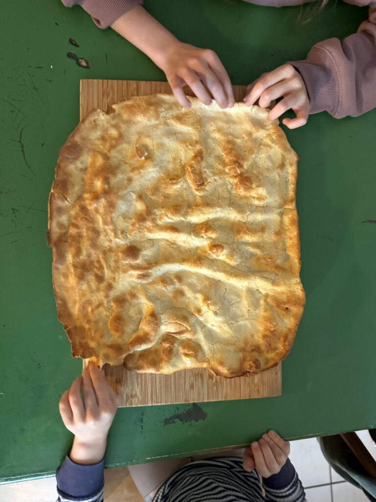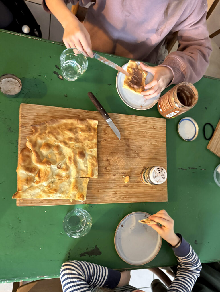 Zuvor schmelze ich ein Stückchen Butter auf einem Backpapier direkt auf dem Backblech – verteile es dann kurz mit dem Pincelchen. Die kleinste ist begeistert, die mittlere sagt, aus der Pfanne sind sie besser – der älteste ist angetan – es spart Zeit und ist lecker. Demnächst möchte ich auf einem Blech schön Ofengemüse anrösten, und dieses dann zusammen mit Feta und frischem Grün zu einer grossen Pfannkuchenrolle füllen – stay tuned …