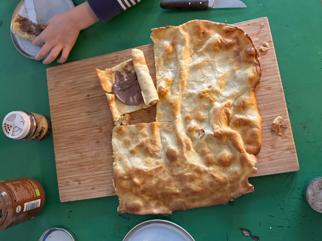 Ich habe mich mit Pfannkuchen versöhnt, da meine Kinder sie so lieben, backe ich sie mittlerweile auch gerne, oder sagen wir so, es ist ok ;-) Da sich aber gerade nur eine brauchbare Pfanne in unserem Haushalt befindet – entschiede ich mich spontan dazu den Teig auf ein Backblech zu kippen um mir heute die Braterei zu sparen.