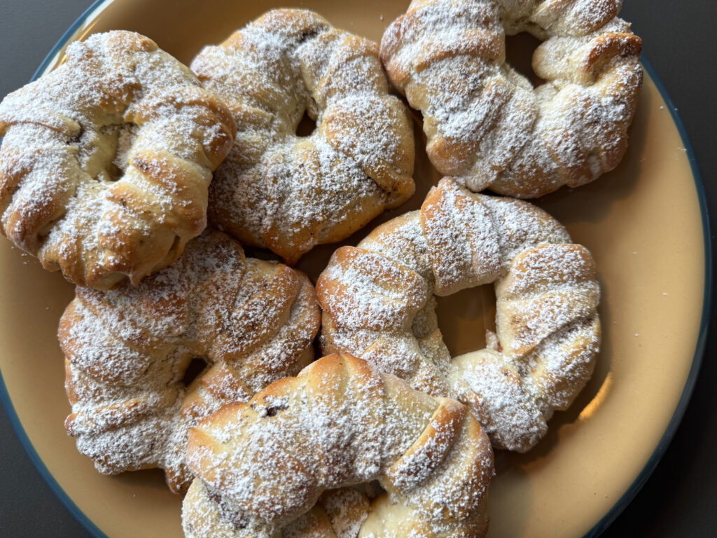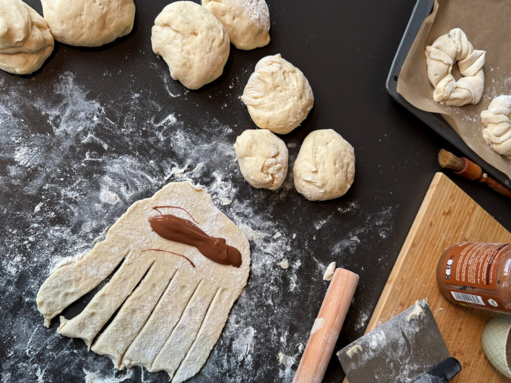 Wasser und Milch erwärmen. Nur lauwarm erhitzen, nicht kochen. Butte darin weich werden lassen. Zucker, Salz und Hefe gut verrühren. Mehl nach und nach zugeben. Erst etwa 500 g Mehl einarbeiten, dann den Rest nach Bedarf zugeben, bis ein weicher, leicht klebriger, gut knetbarer Teig entsteht. So lange kneten, bis der Teig glatt und elastisch ist. Anschließend abgedeckt an einem warmen Ort gehen lassen, bis er sich deutlich vergrößert hat. Den gegangenen Teig in 12 gleich große Stücke teilen. Jede Portion zu einem Rechteck ausrollen, etwas Schokocreme auf das obere Drittel geben und den unteren Teil 5-6 Mal einschneiden. Von der Schokoladenseite her aufrollen – an den Stellen, an denen der Teig verdickt ist, mit einem holzstäbchen nochmal eindrücken und zum Kreis schliessen. Die Teilchen auf ein mit Backpapier belegtes Blech legen und mit der Milch bestreichen. Für extra Glanz kannst du die Milch leicht mit etwas Zucker oder Butter mischen. Im vorgeheizten Ofen bei 180 °C (Ober-/Unterhitze) backen, bis sie goldbraun sind – das dauert etwa 15 Minuten.