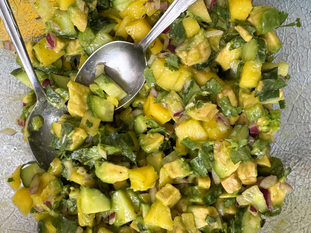 Ein sehr leckerer Salat, den die Münchner Familie zum Einschulungsfest mitgebracht hat: Avocado, Mango, Gurke mit etwas roter Zwiebel und viel Koriander. So lecker, Danke Matthes!