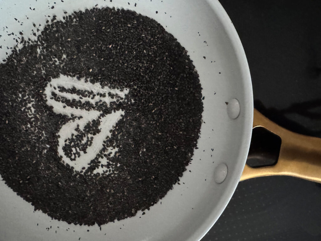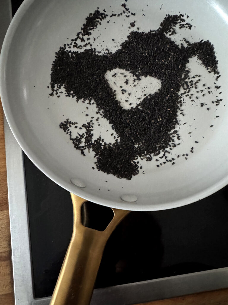 Den schwarzen Sesam in einer kleinen Pfanne ohne Fett kurz anrösten, bis er duftet. Nicht verbrennen lassen.