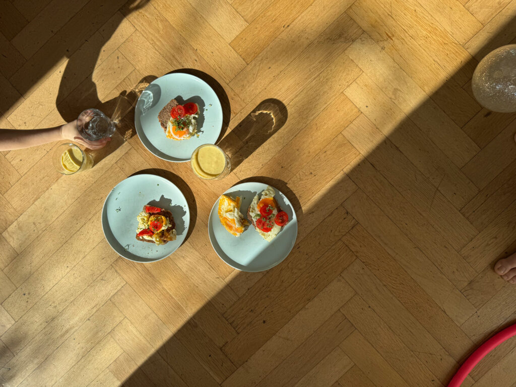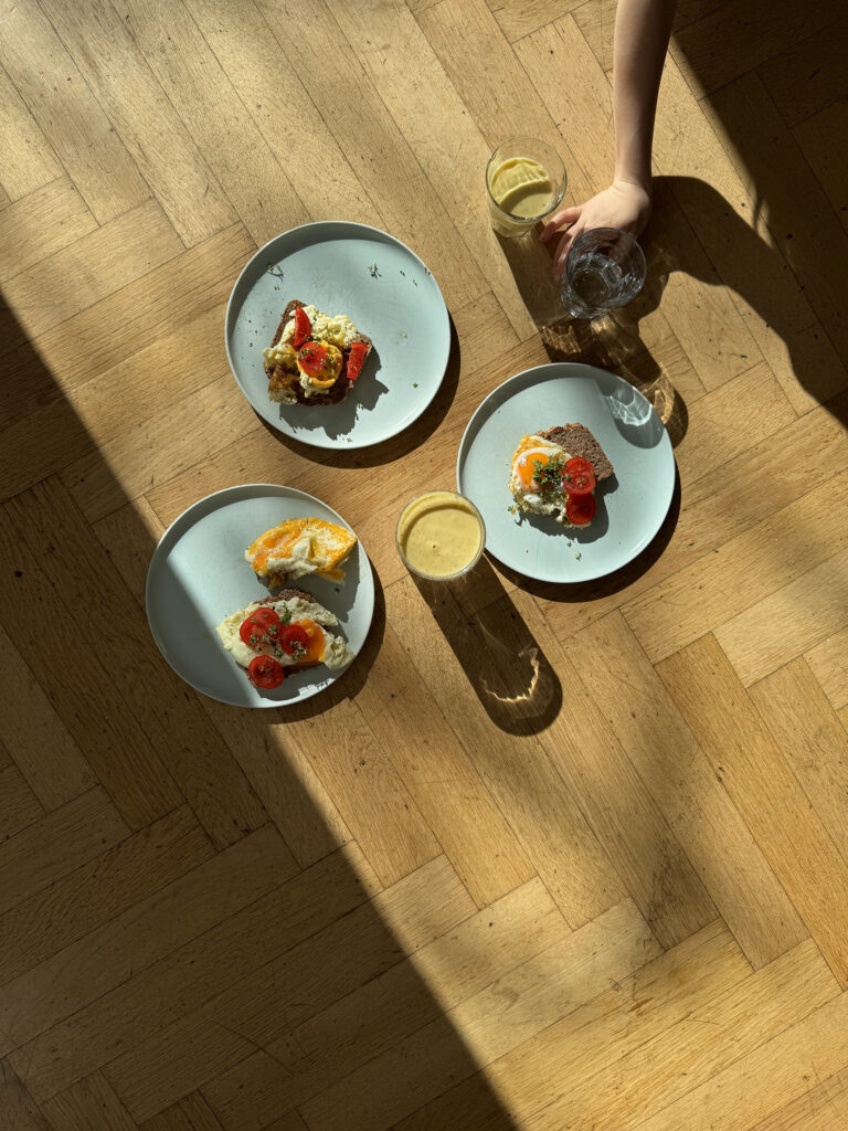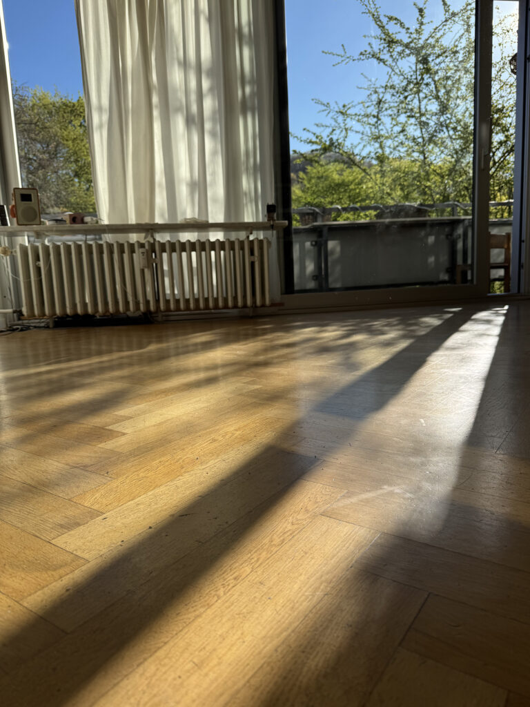 Man kann darin frühstücken, atmen, oder sich einfach hinlegen und nichts tun. Ich hab ein neues Lieblingswort – Sonnenpfützen. Dort, wo das Licht wie flüssiges Gold durch die Fenster fällt und sich auf dem Boden ausbreitet. Man kann sich hineinsetzen, die Wärme auf der Haut spüren, tief atmen, auftanken, oder sich wie ein flüchtiger Lichtfunken darin wiegen, drehen, schweben – leicht, spielerisch, fast wie ein geheimer Tanz mit dem Licht.