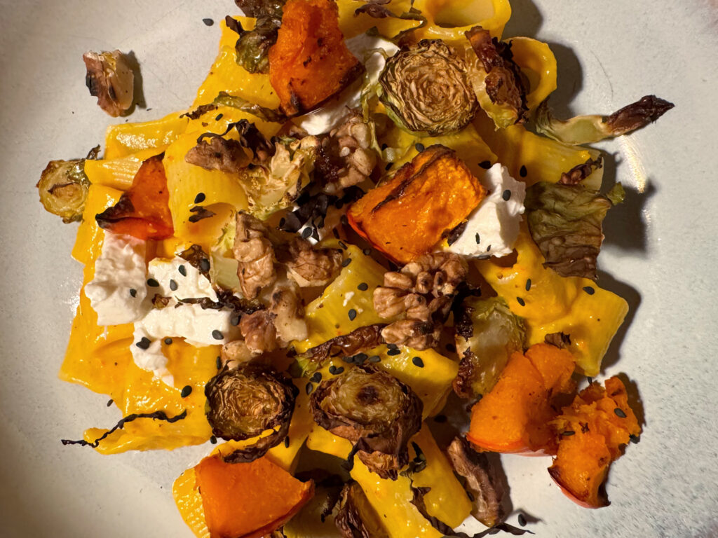 Cremige Kürbis Pasta mit Feta und Rosenkohlknusper