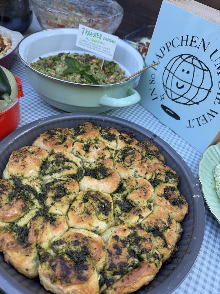 Am vergangenen Donnerstag ging in einem zauberhaften Garten in Niederkassel die zweite Ausgabe von „In 80 Häppchen um die Welt“ über den Rasen. Natürlich hat man als Veranstalter – vermutlich auch als Gast – eine Idee davon, wie es werden soll. Diese wurde aber bei Weitem übertroffen. Das Speisenangebot war einfach unglaublich und reichte von gekräutertem Couscous-Salat über Moretum („Ist ja lateinisch, das macht bestimmt schlau“) und mit Pistazien bestreute Brownies bis zum grün eingefärbten Vanille-Pudding. Und natürlich war es auch jenseits des Essens ein Abend, der in Erinnerung bleiben wird.