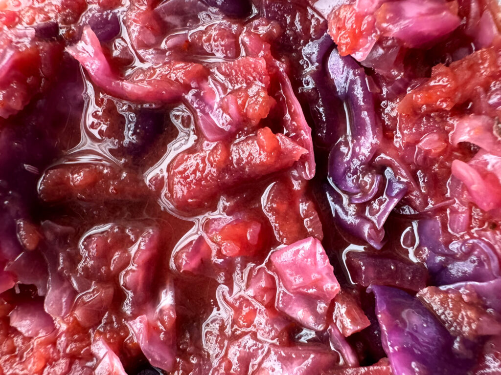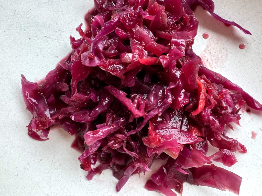 Mit Gochugaru, Sojasauce, Sirup und Miso verrühren. Intensiv schmecken lassen – die Fermentation mildert alles. Karotte grob raspeln, Frühlingszwiebeln in Ringe schneiden. Alles mit Rotkohl und Würzpaste vermengen. Vorsichtig kneten, bis alles gleichmäßig verteilt ist.