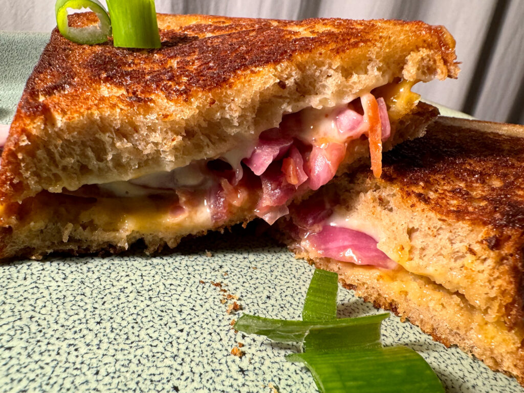 Gestern Abend hatten wir ein köstliches GrilledCheeseKimchi Sandwich, dafür einfach gutes Brot mit Butter bestreichen, mit Butterseite in Pfanne geben, Lieblingskäse – wir hatten gestern Raclette und Cheddar drauf, Kimchi drauf, wieder Käse wieder Brot (Butterseite aussen) – braten, drehen und geniessen – wirklich köstlichst!