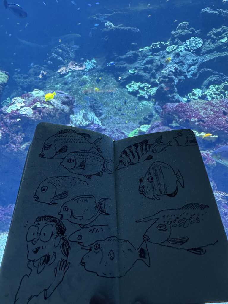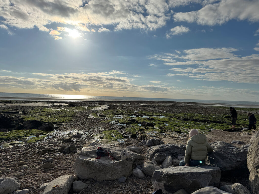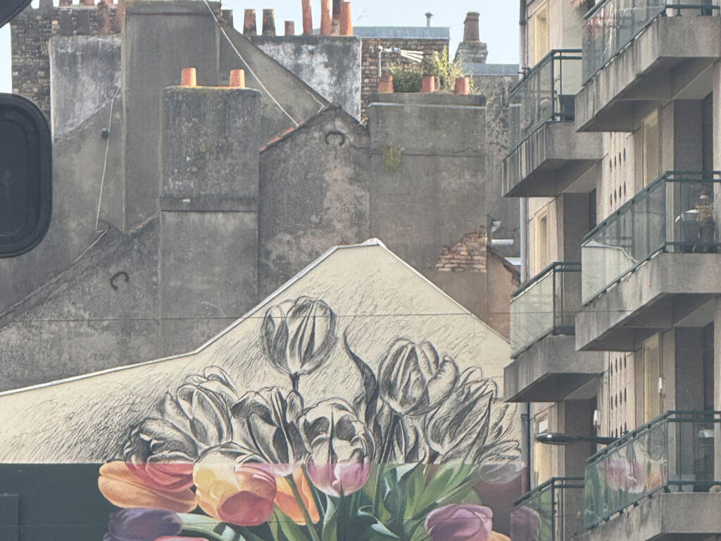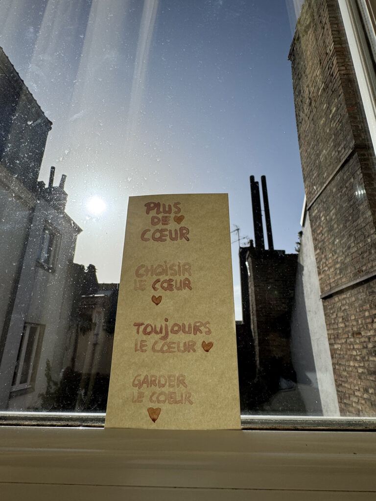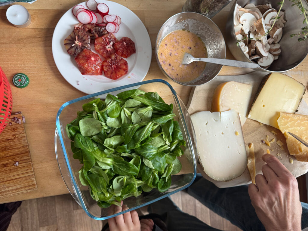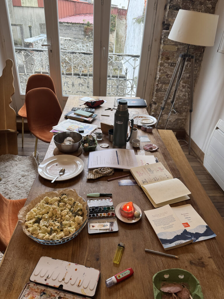 Aneinandergeraten, weil alle hungrig sind. Innerhalb kürzester Zeit reißt der Himmel auf. Sonne. Meer. Ein besonderes Geschenk. Französische Musik. Stuck. Große Fenster. Markt. Baguette, Käse. Leben mit Kindern. Daher gebaut das, dankbar. Le monde doucement.