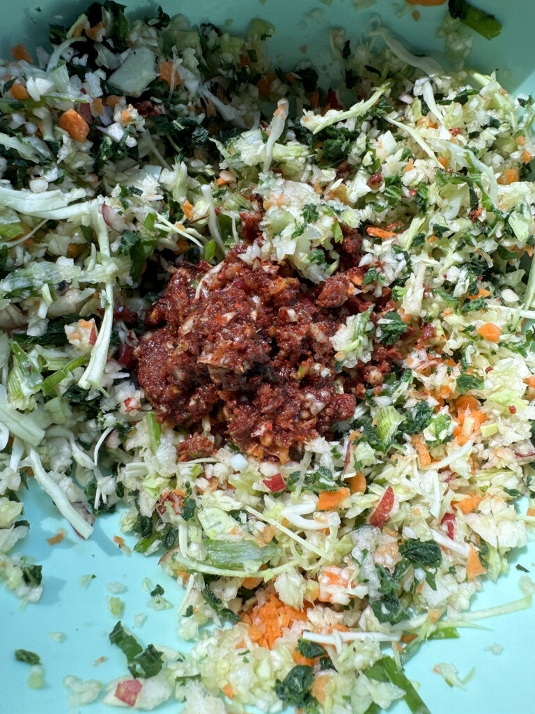 Brennnessel-Kimchi (2. Version): 80–100 g junge Brennnesselblätter (frisch) | 1 kleiner Rettich oder 100 g Weißkohl oder Spitzkohl, fein geschnitten (gibt etwas mehr Textur als »nur« Brennnessel) | 1 Karotte, geraspelt | 2 Frühlingszwiebeln | ½ Apfel oder Birne, geraspelt