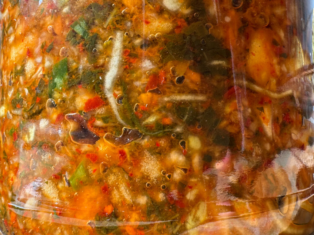 Fermentieren: ins Glas drücken (Flüssigkeit sollte leicht bedecken), 1–2 cm Platz lassen, 1–2 Tage bei Raumtemperatur, dann in den Kühlschrank, ab Tag 2–3 perfekt