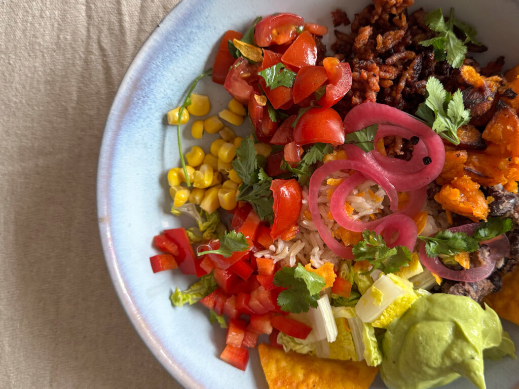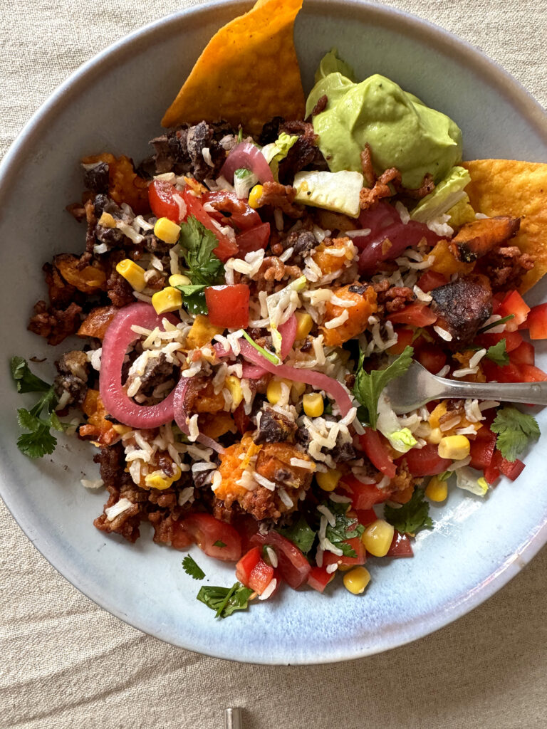 Reis in die Bowl geben, rundherum das anrichten was man mag – Hack, Bohnen & Mais, Romana, Avocado, pinke Zwiebeln, Cheddar, zerbröselte Tortillachips, extra koriander, extra Chilli, etwas Limette darüberpressen. Fertig. Laut. Bunt. Gut.