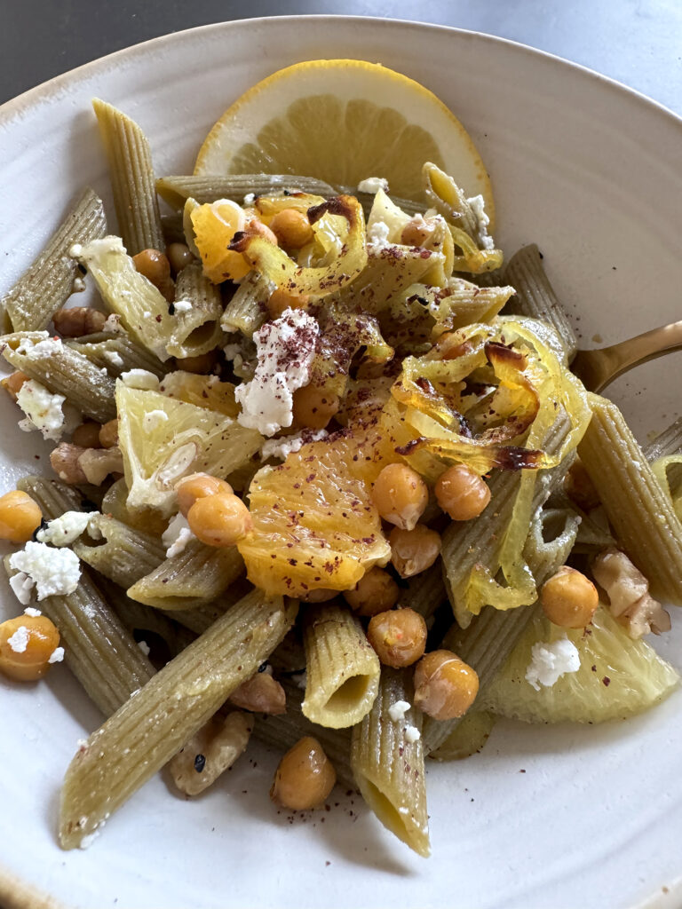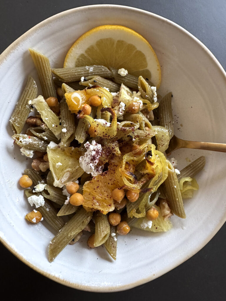 Pasta mit Kichererbsen, karamellisierten Zwiebeln, Zitrusfilets vermischen, nach belieben Feta drüber, die Walnüsse darüber streuen, etwas Sumach und Schwarzkümmel drüber streuen.