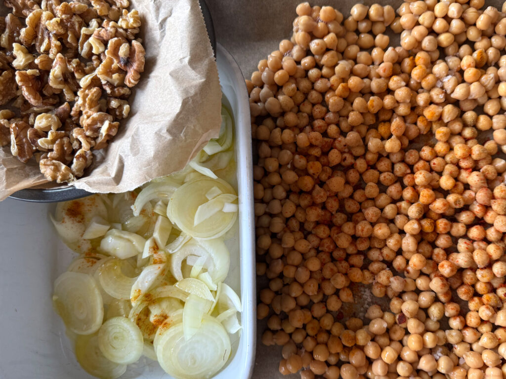 Die Kichererbsen abspülen, trocken tupfen, mit Öl, Kreuzkümmel, Paprikapulver, Chilliflocken, Salz & Pfeffer würzen. Die Zwiebel in Ringe schneiden, mit etwas Öl etwas Honig, sowie Salz mischen. Beides zusammen im Backofen etwa 20 Min bei 200 °C rösten.