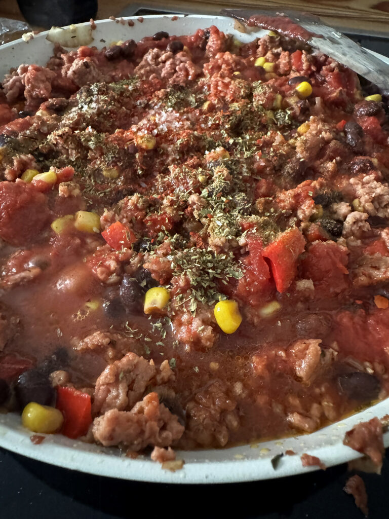 ComingSoon: Gedächtnisstütze: Veganes Hack (Linsen würden auch gut funktionieren (bei meinen Kindern allerdings nicht ganz so gut) – oder auch eine Pilz-Blumenkohl-Base, als »Fleischbasis«, so wie hier» – Ordentlich kreuzkümmel und Oregano, schwarze Bohnen, Mais, Dosentomaten.