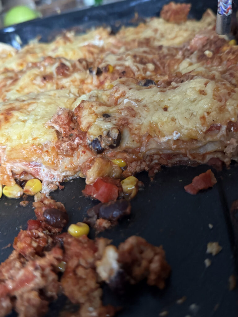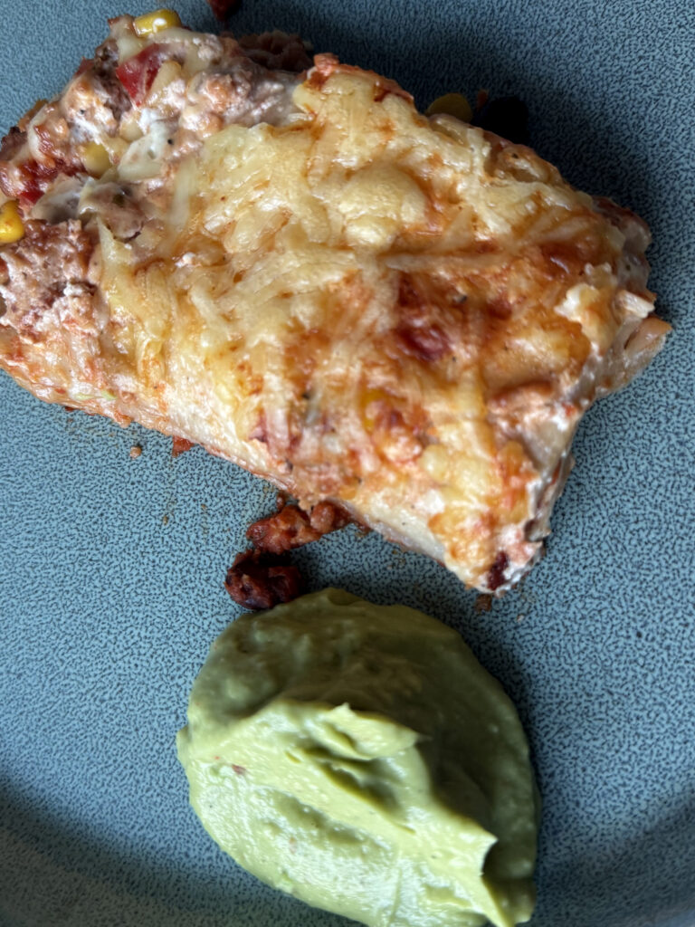 Statt Lasagneplatten – Tortillas Schichten – sosse zuerst, weisse Sosse: Frischkäse und Joghurt mit etwas Zitrone und frischem Knoblauch … mit Reibekäse überbacken, dazu: Avocadocreme mit Kreuzkümmel, Zitronensaft und Knoblauch … hmmm!!!