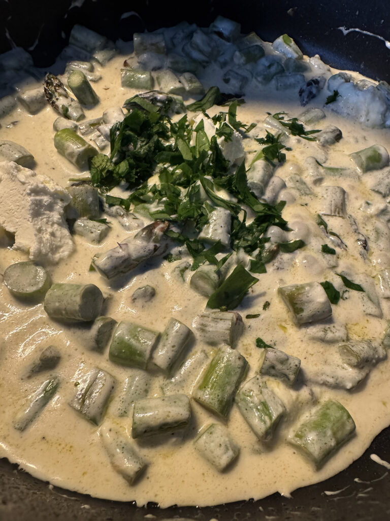 Eigentlich wollte ich nach dem herrlichen Tag auf der Galopprennbahn einen neuen Salat machen mit dieser Kombination, doch die Kinder waren auch hungrig … und wollten Spargelpasta. Also habe ich Spargelpasta fast so wie immer gemacht: grünen Spargel in der Pfanne angebraten, etwas Frischkäse dazugegeben, mit Salz und Pfeffer abgeschmeckt, ordentlich Sauerampfer und Minze eingerührt und mit Pasta gemischt.
