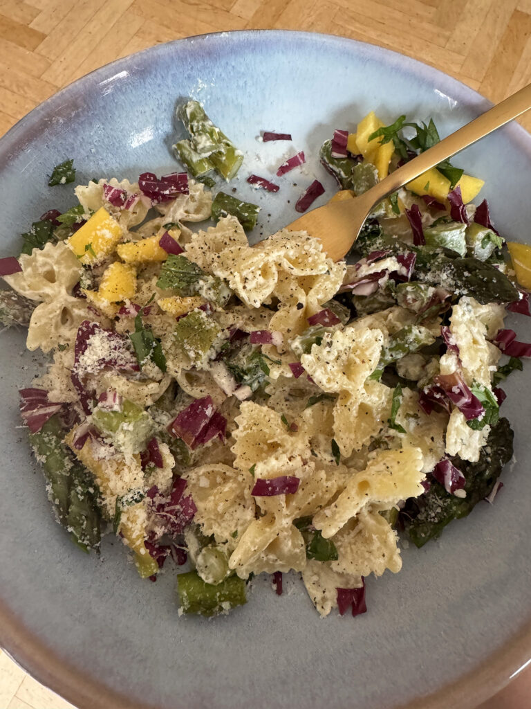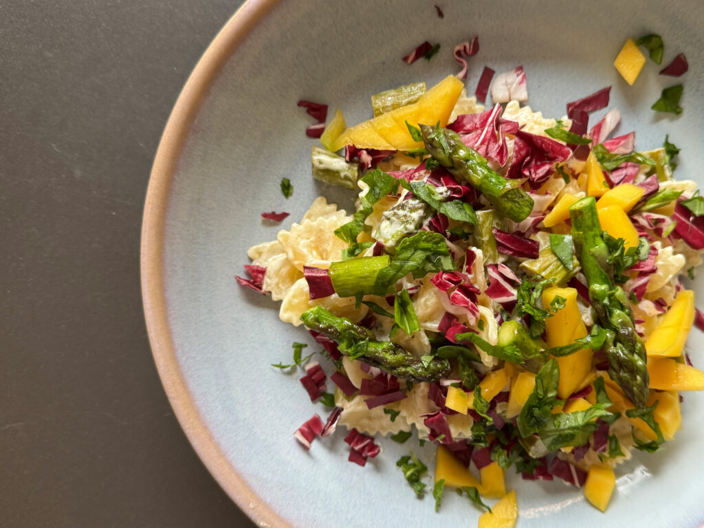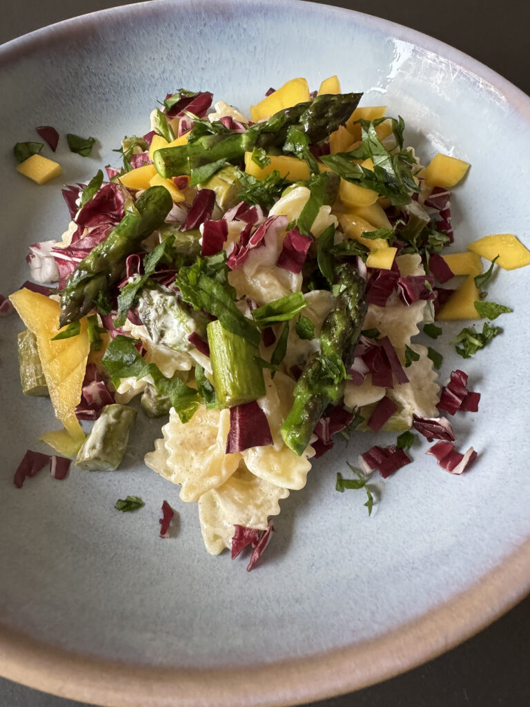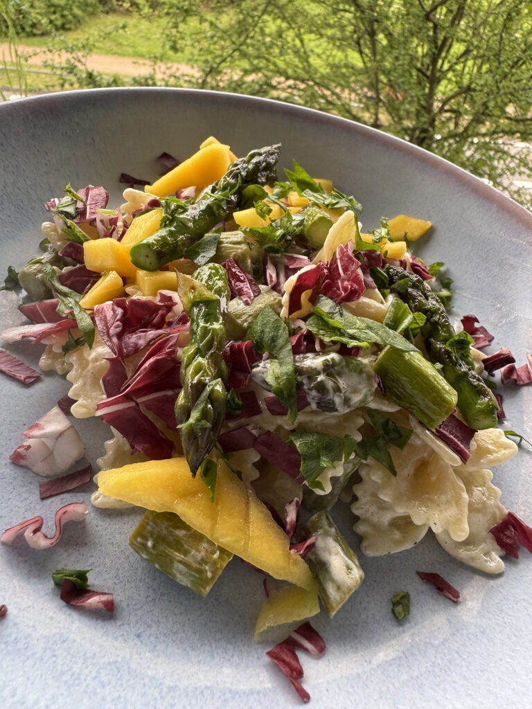 Für uns Erwachsene habe ich die Pasta dann noch mit Radicchio und Mango gemischt – ein Kompromiss sozusagen, und das war verdammt lecker. Daher dies als Gedächtnisstütze … die geplante Salatidee – Spargel, Mango, Radicchio – kommt demnächst, also vielleicht. Dazu sollte es knusprige Linsen geben oder knusprigen Quinoa, wir werden sehen